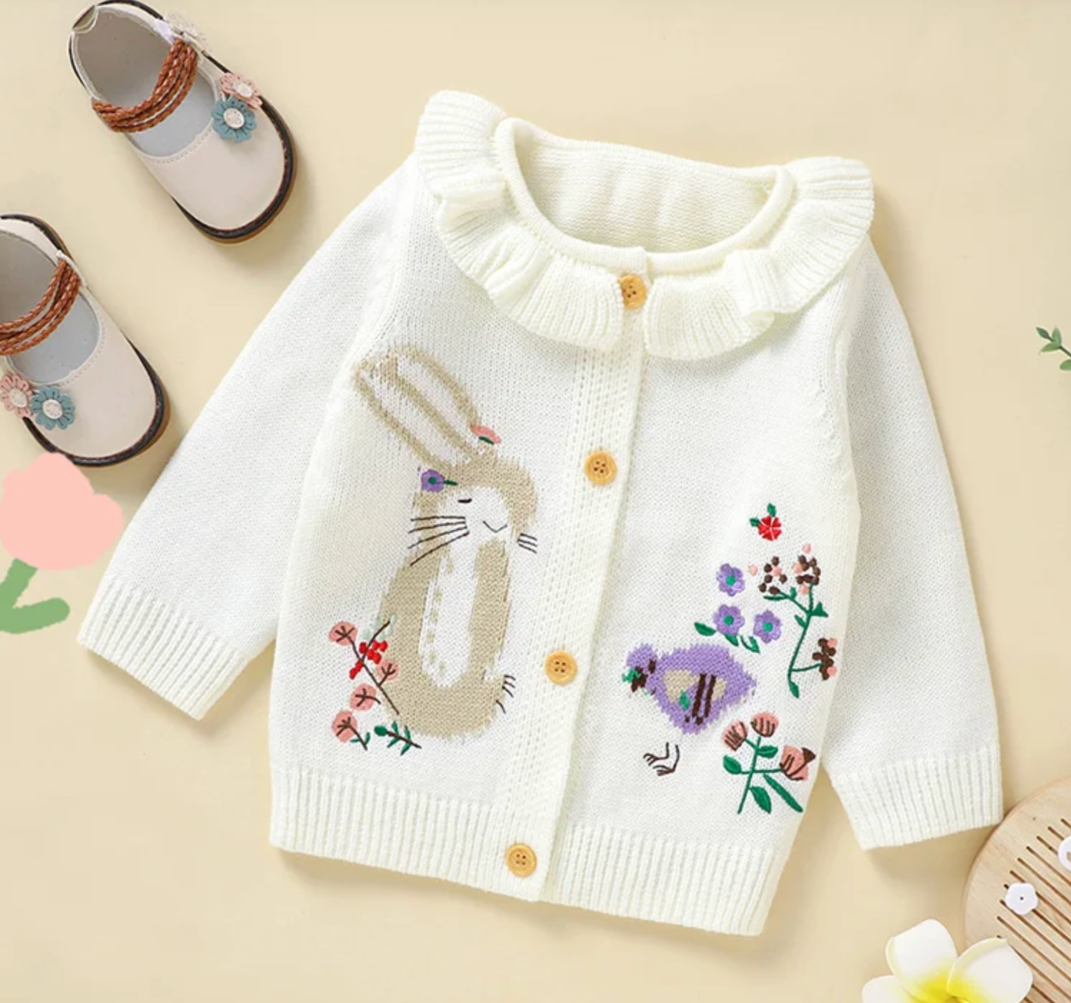 LittleMaylah™ soft ruffled baby cardigan with bunny jacquard. Cozy, cute, and perfect for everyday wear.